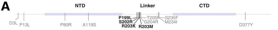 FIGURE 2: N Protein Enhanced Replication. (A) Map of SARS-CoV-2 N domains showing the locations of observed mutations. Mutations that were observed to enhance signal are shown in bold. (B) RT-qPCR of supernatant collected from A549-ACE2 cells infecte